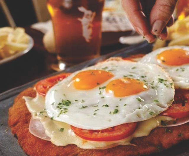rellena con queso, milanesa y 4 huevos fritos arriba