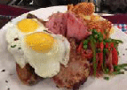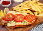 (Chivito Uruguayo) Churrasco, jamón, mozzarrella, panceta ahumada, pimientos asados, aceitunas, palmitos, acompañado con papas fritas, rusa, lechuga y tomate