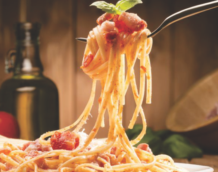 panceta, cebolla y marsala, crema, aros de cebolla, morrones y papas españolas